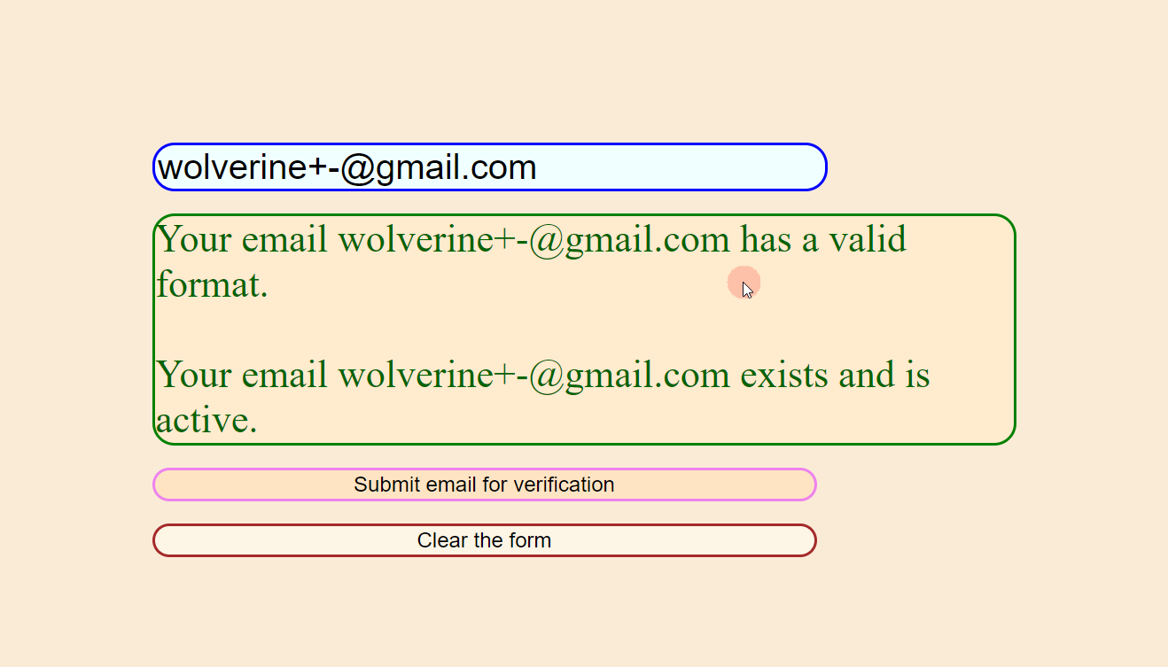 First up, we prompt the user to input the email they want to validate. Below that, we have a submit button to run the email validation, and a clear button to reset everything. Last, we display the result of the email validation check using jQuery in a paragraph (<p>) element that we initially hide.